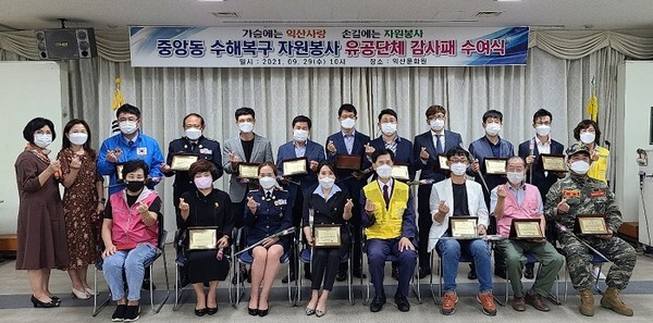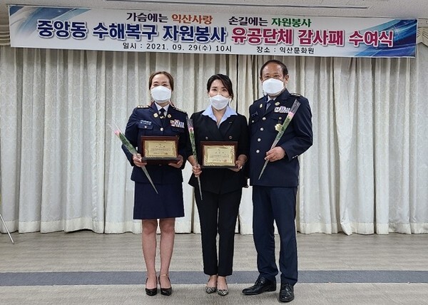 익산소방서 의용소방대 연합회(남성회장 황인주, 여성회장 김영미)가 29일 익산시 자원봉사센터(이사장 엄양섭)로 부터 수해복구 유공과 관련해 감사패를 받았다.