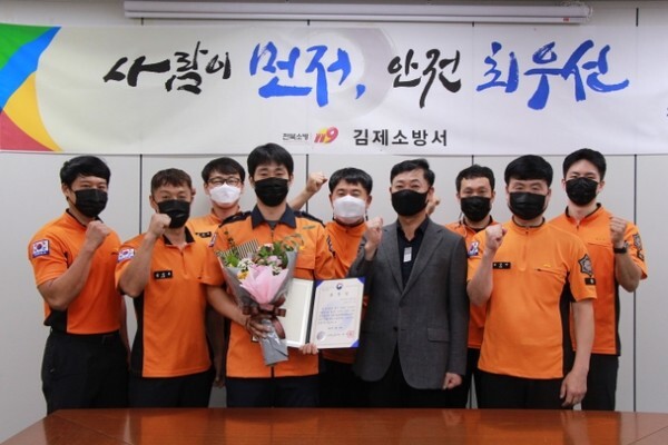 김제소방서(서장 전두표)는 올해 3분기‘으뜸 귀감소방관’으로 119구조대 강지웅 소방사를 선발하고 표창장을 수여했다.