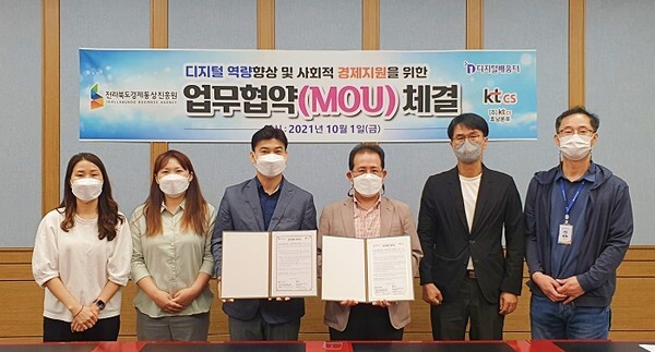 전라북도경제통상진흥원(원장 이현웅, 이하 경진원) 사회적경제지원센터와 (주)케이티 씨에스(KT CS) 디지털배움터는 지난 1일 디지털을 활용한 사회적경제기업의 활성화를 목표로 상생협력 MOU를 체결했다.