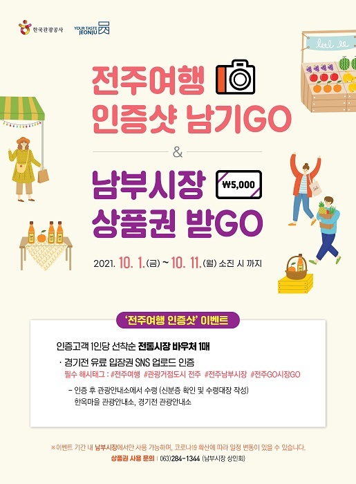 전주시와 한국관광공사는 오는 11일까지 시민과 여행객을 대상으로 ‘전주여행 인증샷 남기Go, 남부시장 바우처 받Go’ 이벤트를 운영한다.