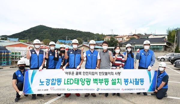 전라북도자원봉사센터와 무주군자원봉사센터, 무주양수발전소, 한전KPS 등 20여 명의 관계자들은 5일 가로등 불빛이 약하거나 미 설치된 무주읍내 골목 40개소를 선정해 LED태양광 벽부등을 설치했다.
