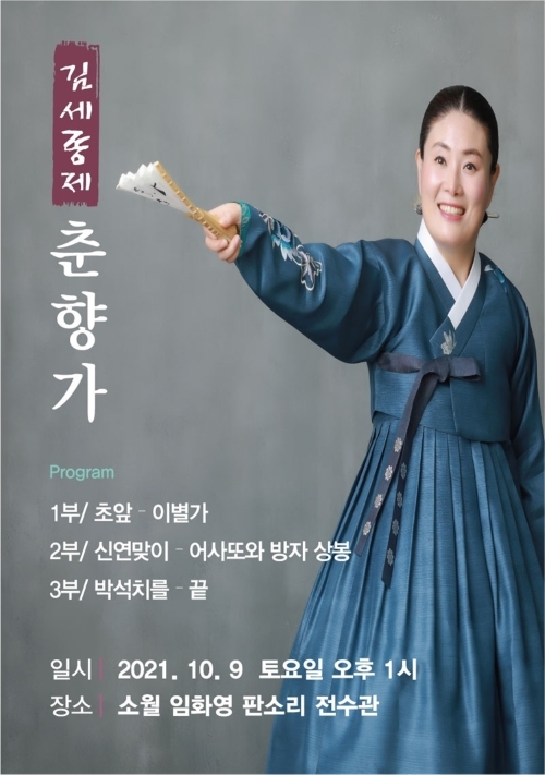 1부 초앞-이별가, 2부 신연맞이-어사또와 방자 상봉, 3부 박석치를-끝 등으로 구성된 발표회에는 정숙씨와 함께 임청현 전북도립국악원 고수부 교수와 추계예술대학교 4학년에 재학 중인 홍민균씨가 고수로 참여한다.