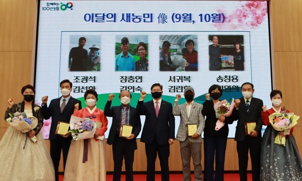 전북농협에 따르면 9월 새농민상에는 조광석·김선화 부부(신흥농장·논콩), 김인숙·장충연 부부(우리농장·복분자)가, 10월 이달의 새농민상은 서귀복·김란희 부부(농도누리·멜론), 송창용·안영희 부부(천태산농장·수도작) 등 총 4부부가 수상의 영예를 안았다.