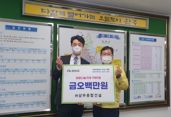 13일 봉동읍은 ㈜삼부종합건설이 첫 번째 사랑나눔 기부금 500만원을 전달해왔다고 밝혔다. 기부금은 희망나눔가게를 이용하는 수급자, 복지사각지대 등 취약계층이 필요한 물품을 구입하는데 사용된다.