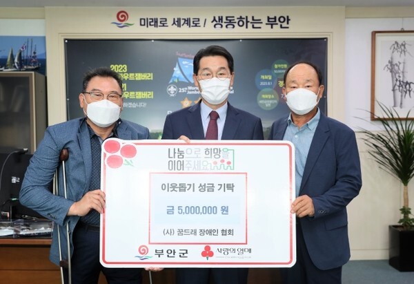 (사)꿈드래장애인협회(회장 하태복)는 13일 주변의 어려운 이웃들을 위해 사용해 달라며 이웃돕기 성금 500만원을 부안군에 기탁했다.