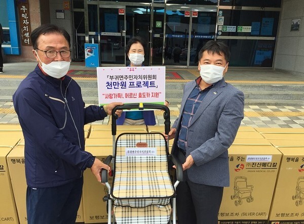 기탁한 효도카는 보행보조기를 말하는 것으로 부귀면 주민자치위원회가 자발적으로 추진하는 ‘1000만원 프로젝트’ 사업의 일환으로 마련됐다.