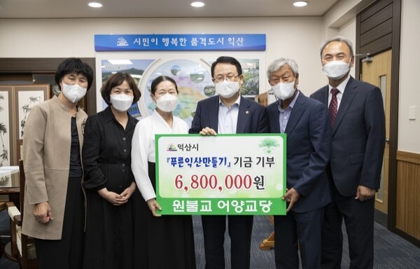 원불교 익산 어양교당은 지난 15일 정헌율 익산시장을 방문해 환경친화도시 푸른익산 만들기에 써 달라며 성금 680만원을 쾌척했다.