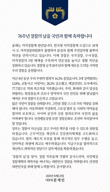 경찰의날 메시지 “법적 · 보호 통해 적극적 임무 수행 지원…직급구조 개선”