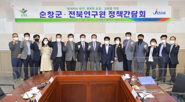 순창군과 전북연구원은 최근 순창군 건강장수연구소 세미나실에서 황숙주 군수와 간부공무원, 권혁남 전북연구원장과 본부장 등 20여명이 참석한 가운데 군 주요 현안사업 추진방향 및 성공운영 전략에 대한 정책간담회를 개최했다