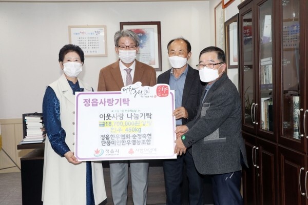 정읍한우협회(박승술 지부장)는 11월 1일 ‘한우 먹는 날(한우데이)’을 기념해 어려운 이웃돕기 성금 1870만 원을 정읍시(시장 유진섭)에 전달했다.