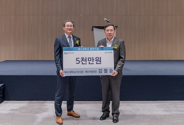 제17대 예수대학교 이사장으로 선임된 김철승 예수병원장이 예수대에 5000만 원을 후원했다.