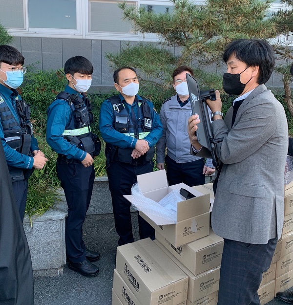 방패를 개발한 KIST 전북 복합소재기술연구소 구조용복합소재연구센터 이민욱 박사가 직접 현장 경찰관들을 만나 방패 사용법을 시연했다.