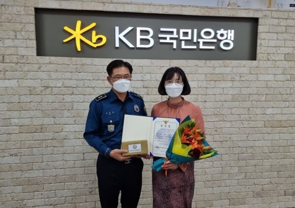전주완산경찰서(서장 김주원) 남문지구대(경감 류창희)는 4일 국민은행 전주종합금융센터를 방문해 전화금융사기(보이스피싱) 범죄 피해를 예방한 은행원 A씨(49·여)에게 감사장을 전달했다고 밝혔다.