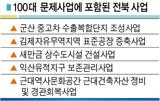최근 국민의힘은 내년도 예산안 100대 문제사업을 선정하고 관련 예산을 삭감하겠다고 밝힌 바 있다. 100대 문제사업에 포함된 전북 사업은 △군산 중고차 수출복합단지 조성사업 △김제자유무역지역 표준공장 증축사업 △새만금 상수도시설 건설사업 △익산유적지구 보존관리사업 △근대역사문화공간 근대건축자산 정비 및 경관회복사업 등 5건이다.