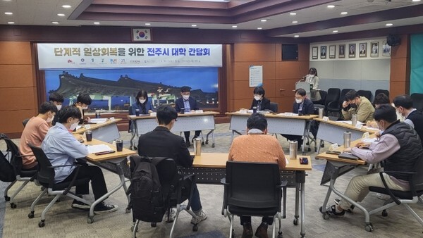 시는 4일 전북대학교·전주대학교·전주교육대학교·예수대학교·전주기전대학교·전주비전대학교 등 6개 대학 방역 담당자와 총학생회 관계자가 참석한 가운데 ‘단계적 일상회복 대응 간담회’를 개최했다.