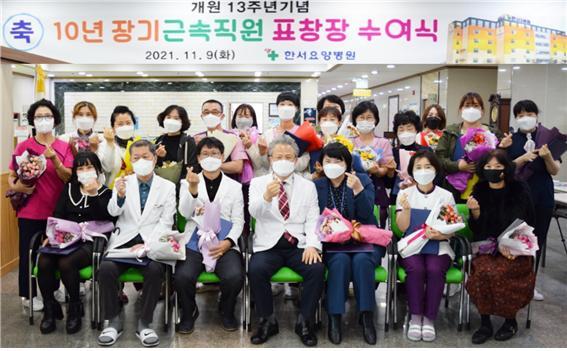 정읍 한서요양병원(병원장 이용호)은 지난 9일 병원 1층 로비에서 ‘개원 13주년 기념식 및 10년 장기근속 직원 표창 수여식’을 가졌다.