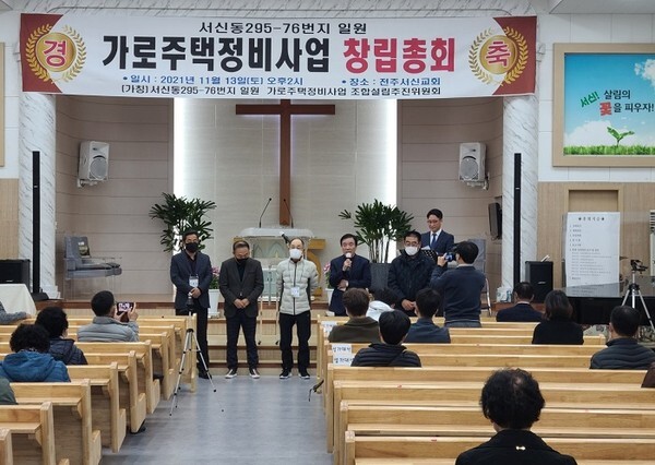 전주 서신동 295-76번지 일원 가로주택정비사업 조합설립 추진위원회는 지난 13일 전주서신교회에서 조합창립총회를 열고 전체 조합원 68명 중 58명(85.29%)의 동의를 얻어 가로주택정비사업 시행 안 등을 통과시켰다.