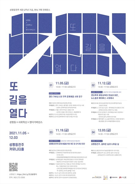 전주시사회혁신센터 성평등전주(소장 조선희)는 전주시, 행정안전부와 함께 오는 19일 성평등전주 커뮤니티홀에서 성평등전주 개관 2주년 기념 연속기획 콘퍼런스 ‘성평등×사회혁신×젠더거버넌스, 또 길을 열다’를 개최한다.
