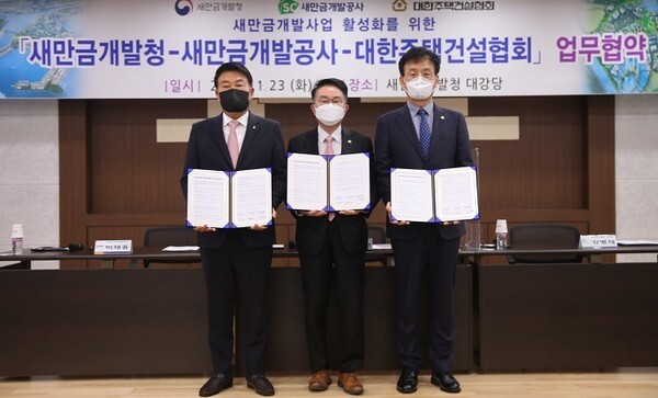 새만금개발청(청장 양충모)과 새만금개발공사(사장 강병재)는 23일 국내 주택업계의 대표 단체인 대한주택건설협회(회장 박재홍)와 새만금 내 주택·도시 개발을 위한 업무협약을 체결했다.