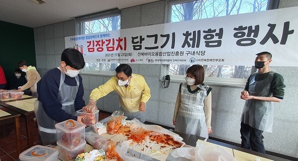 전북바이오융합산업진흥원(이하 바이오진흥원)은 23일 전주시, 한국자산관리공사, 전북장애인부모회와 함께 전주 지역 발달장애인 50여명을 초대해 김장김치 담그기 행사를 진행했다.