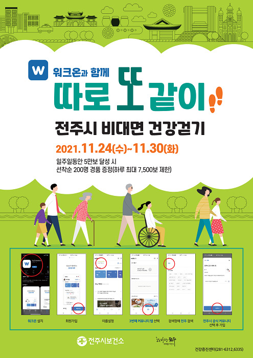참여 희망자는 개인 휴대폰에 ‘워크온’ 앱을 설치한 뒤 전주시 공식 커뮤니티에 가입하고 챌린지 참여하기 버튼을 눌러 걷기에 참여하면 된다.