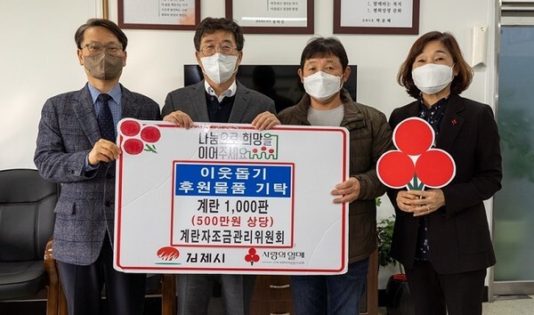 계란자조금관리위원회(위원장 김양길)는 25일 관내 저소득 소외계층 가정의 건강 증진을 위해 김제시에 계란 1000판을 전달했다.