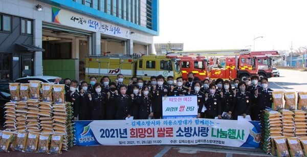 김제시 의용소방대연합회(회장 오형진, 김옥자) 지난 26일 김제소방서에서 어려운 이웃에게 사랑의 쌀 나눔 행사를 펼쳤다.