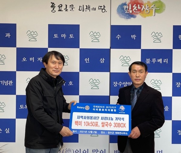 장수군 계북면 주민자치위원회(위원장 송창점)와 자매결연 맺고 있는 국제로타리 3670지구 이리동로타리클럽(회장 김영만)이 지난 2일 관내 어려운 이웃들이 따뜻한 겨울을 보낼 수 있도록 사용해 달라며 쌀국수 25박스, 백미 50포(10kg)를 계북면사무소에 기탁했다.