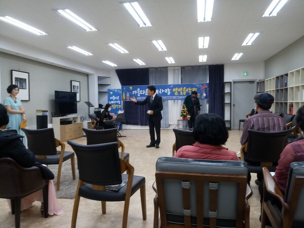 아름다운노래사랑(한국) 별빛음악회(회장 조영숙)가 지난 2일 고창읍 소재 아름다운청춘카페에서 별빛음악회를 열었다. 별, 고향생각, 님이 오시는지 등 우리에게 익숙한 가곡부터 마중, 첫사랑 등 새로 사랑받는 신작 가곡까지 다양한 곡으로 아름다운 노래 사랑의 밤을 선사했다.