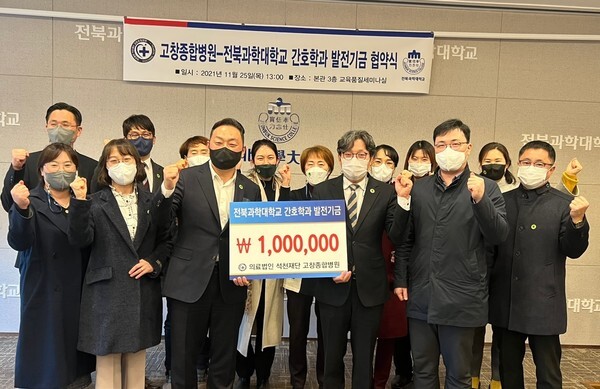 전북과학대학교(총장 이영준)는 최근 의료법인 석천재단 고창종합병원(이사장 조남열)과 간호학과 발전기금 매년100만원 기부 협약을 체결했다고 밝혔다.