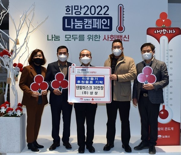 (주) 상상(대표 최종익)이 관내 저소득 가정 및 사회복지시설을 위해 덴탈마스크 30만 장 기부를 통해 어려운 이웃에게 사랑을 전하는‘희망 2022 나눔 캠페인’에 동참했다.