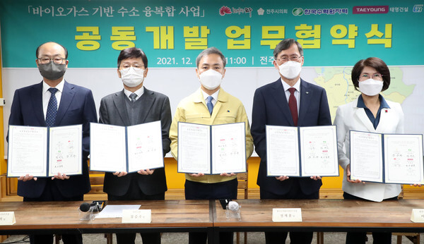 전주시와 전주시의회, 한국수력원자력㈜(사장 정재훈), ㈜태영건설(대표이사 이재규), 전북도시가스㈜(대표이사 김홍식)는 14일 전주시장실에서 바이오가스 기반 수소 융복합사업 공동개발 업무협약을 체결했다.