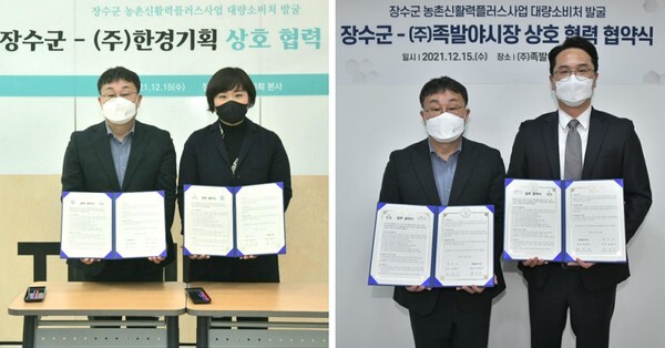 장수군이 15일 지역 농·특산물의 판로기반 마련을 위해 ㈜한경기획, ㈜족발야시장 등 프리미엄 기업과 동반 상생 업무협약을 체결했다.
