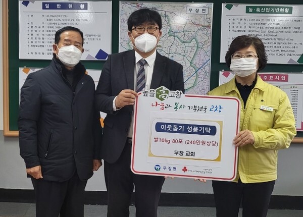 고창 무장교회(담임목사 김건호·무장면)가 무장면 행정복지센터를 찾아 어려운 이웃에 전해 달라며 백미 80포(240만원 상당)를 기탁했다.