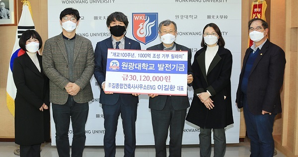 특히 원광대 동문인 이길환 대표(1990년 건축공학과 졸업)는 평소 천사기부 운동을 펼치고 있는 가운데 모교 건축학과, 건축공학과, 도시공학부에 각각 1004만원씩을 기탁해 의미를 더했다.