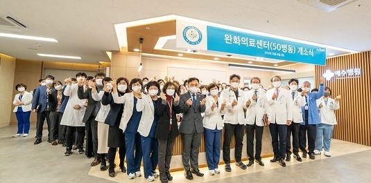 새롭게 증축한 암센터 5층에 단장한 완화의료센터는 1인실과 4인실, 상담실, 가족실, 임종실, 목욕실 등을 갖췄으며 전담 의료팀은 의사, 간호사, 사회복지사, 성직자, 자원봉사자 등으로 구성됐다.