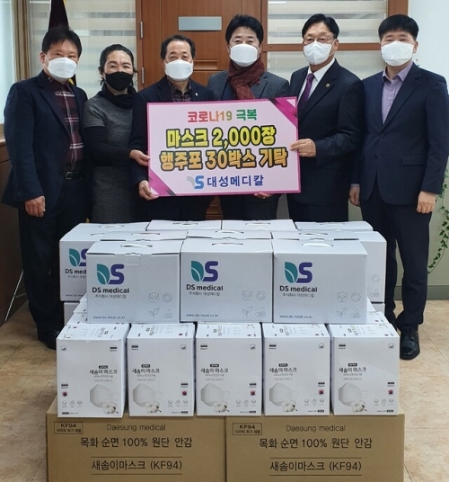 익산시 낭산면 소재 ㈜대성메디칼(대표 양용호)는 22일 저소득층 어르신들을 위해 써 달라며 마스크 2000장과 행주포 30박스를 인화동 행정복지센터(동장 김석기)에 기탁했다.