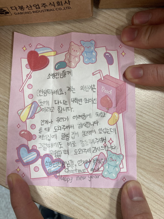 익산소방서가 초등학생이 전해 준 응원의 감사편지와 감짝선물로 깊은 감동에 빠졌다.