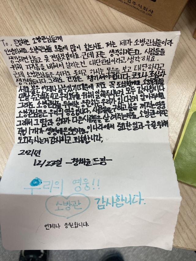 최다인 학생은 “언제나 우리가 어려움에 처했을 때 도와 주셔서 감사합니다.저희집에 말벌집이 생긴적이 있었는데 그럴때도 바로 출동해 주셔서 위험할 때 도와주셔서 감사드립니다. 소방관 선생님들 언제나 행복하세요”라는 감사의 메세지를 담았다.