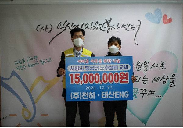 ㈜천하(대표 강희곤)와 태산ENG(대표 고정세)는 지난 27일 익산시자원봉사센터(이사장 엄양섭)를 방문해 사랑의 빵굼터 노후설비 교체에 사용해 달라며 성금 1500만원을 쾌척했다.