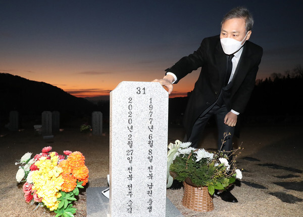 김승수 전주시장이 3일 국립대전현충원을 찾아 코로나19 감염 확산 방지에 최선을 다하다 과로로 사망한 순직공무원 고(故) 신창섭 주무관을 추모했다.