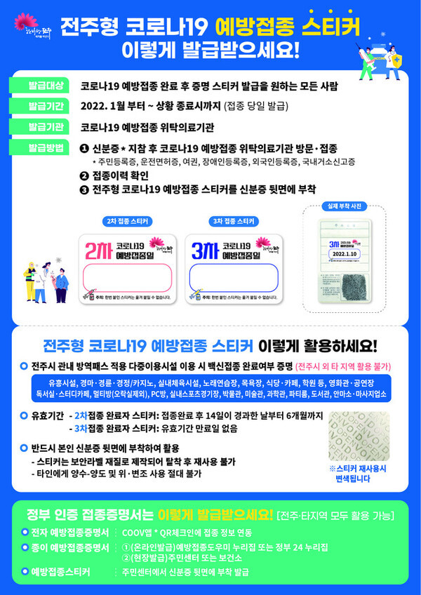 2022년 새해부터는 스마트폰 사용이 어려워 코로나19 예방접종 전자 증명을 사용하지 못하는 시민들도 다중이용시설을 편리하게 이용할 수 있게 됐다. 전주시가 질병관리청 쿠브(COOV) 앱 등 전자 증명 사용이 어려운 시민들을 위해 전주형 코로나19 예방접종 스티커를 제작해 배부키로 했기 때문이다.
