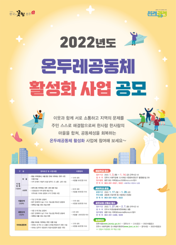 시와 전주시 사회적경제·도시재생 지원센터는 ‘2022년 온두레공동체 육성사업’ 추진을 앞두고 오는 14일까지 공동체 역량을 강화할 수 있는 예비학교에 참여할 회원을 모집한다.