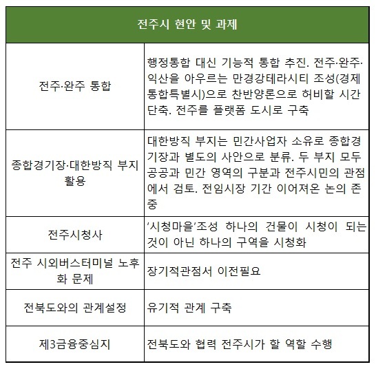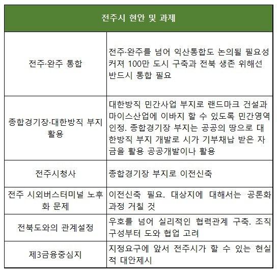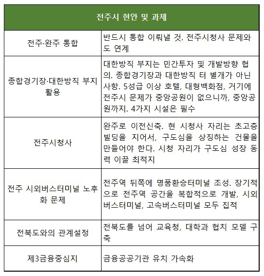 그는 “시청사 문제는 통합과도 연관이 있다”면서 “새 시청사는 완주로 이전해야 하고, 현 시청사 자리엔 초고층 빌딩을 지어 구도심을 상징하는 랜드마크를 조성하면 전주성장 동력의 최적지가 될 것”이라고 진단했다.