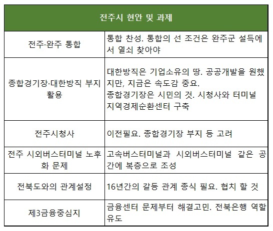 대한방직과 종합경기장 부지 활용 방식에 대해선 민간의 영역을 존중하되 반드시 전주시민을 위한 방향으로 개발이 필요하다고 역설했다.