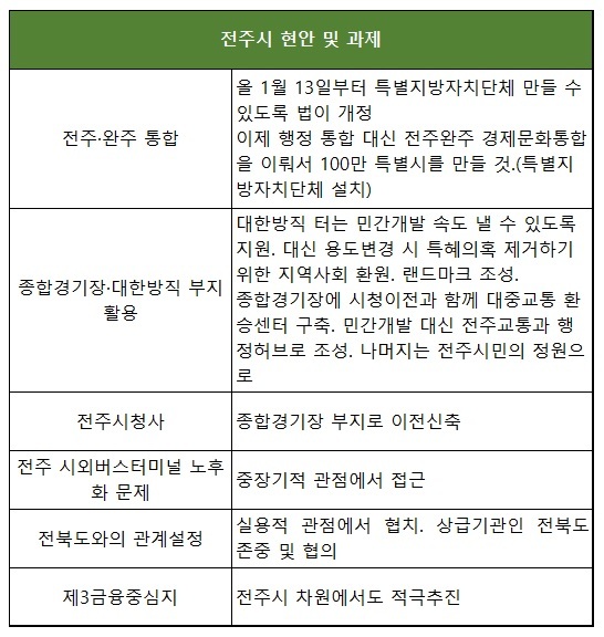 전주시청사 문제에 대해선 “시청사 이전이냐, 아니냐가 아닌 제3의 답을 찾고자한다”면서“시청이 바로 시민의 삶으로 들어가는 시청마을 조성방안을 적극 검토 하겠다”고 말했다.