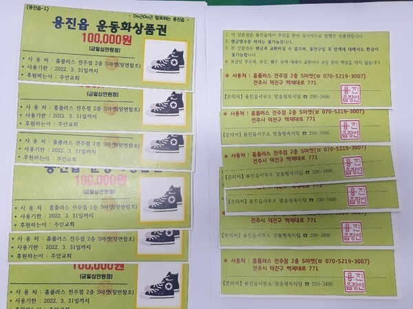 완주군 용진읍 소재 주안교회가 중‧고교에 입학하는 저소득층 학생들을 위해 120만 원 상당의 운동화 상품권 12매를 용진읍에 기탁했다. 용진읍은 기탁된 상품권을 관내 중‧고등학교 신입생 12명에게 전달했다.