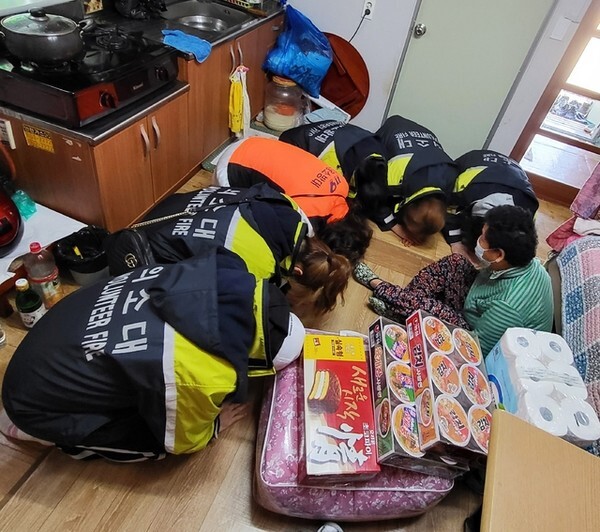 익산 함열여성의용소방대가 지난 5일 함열지역 독거노인들을 찾아 봉사와 나눔을 실천했다. /사진 제공=함열여성의용소방대