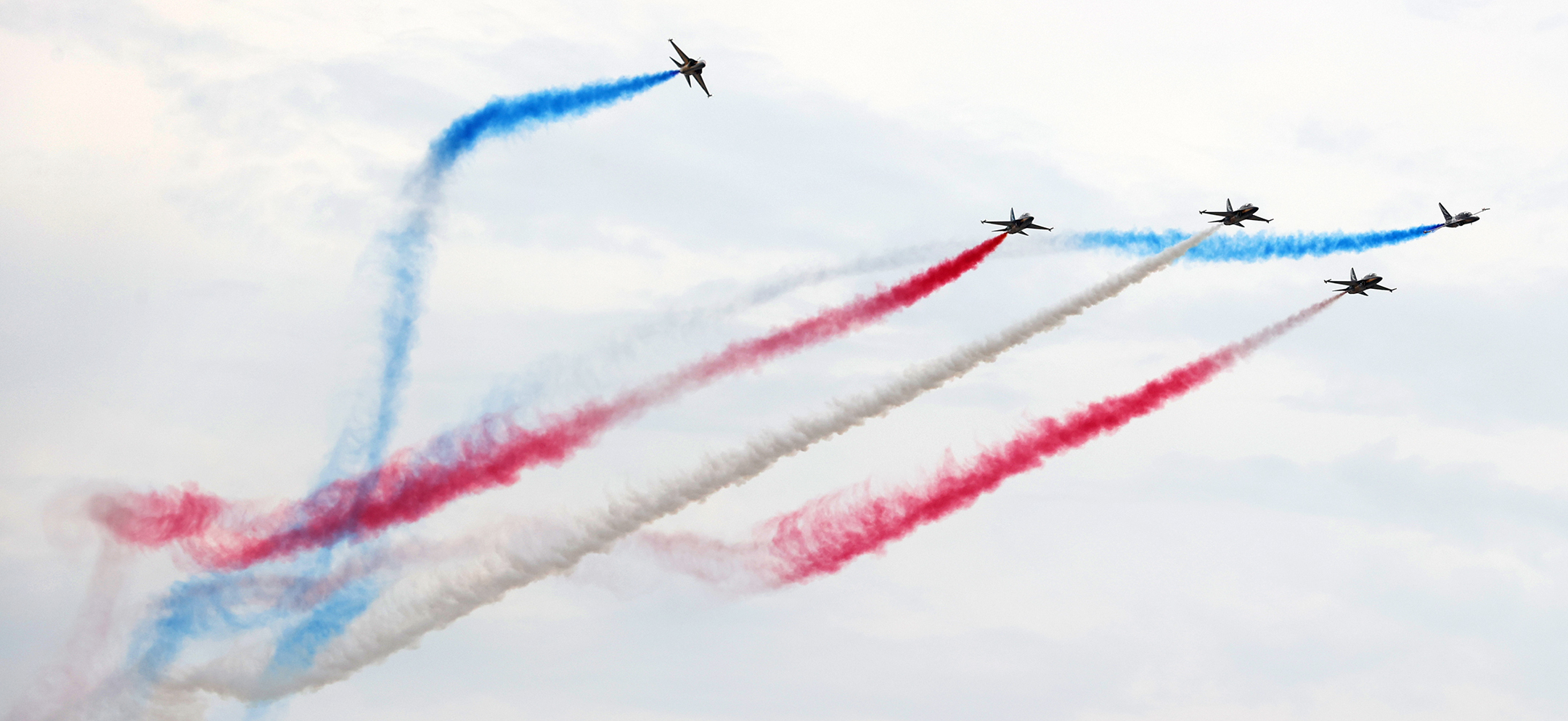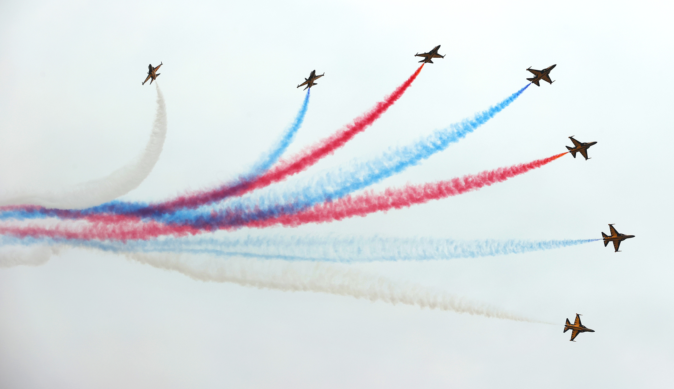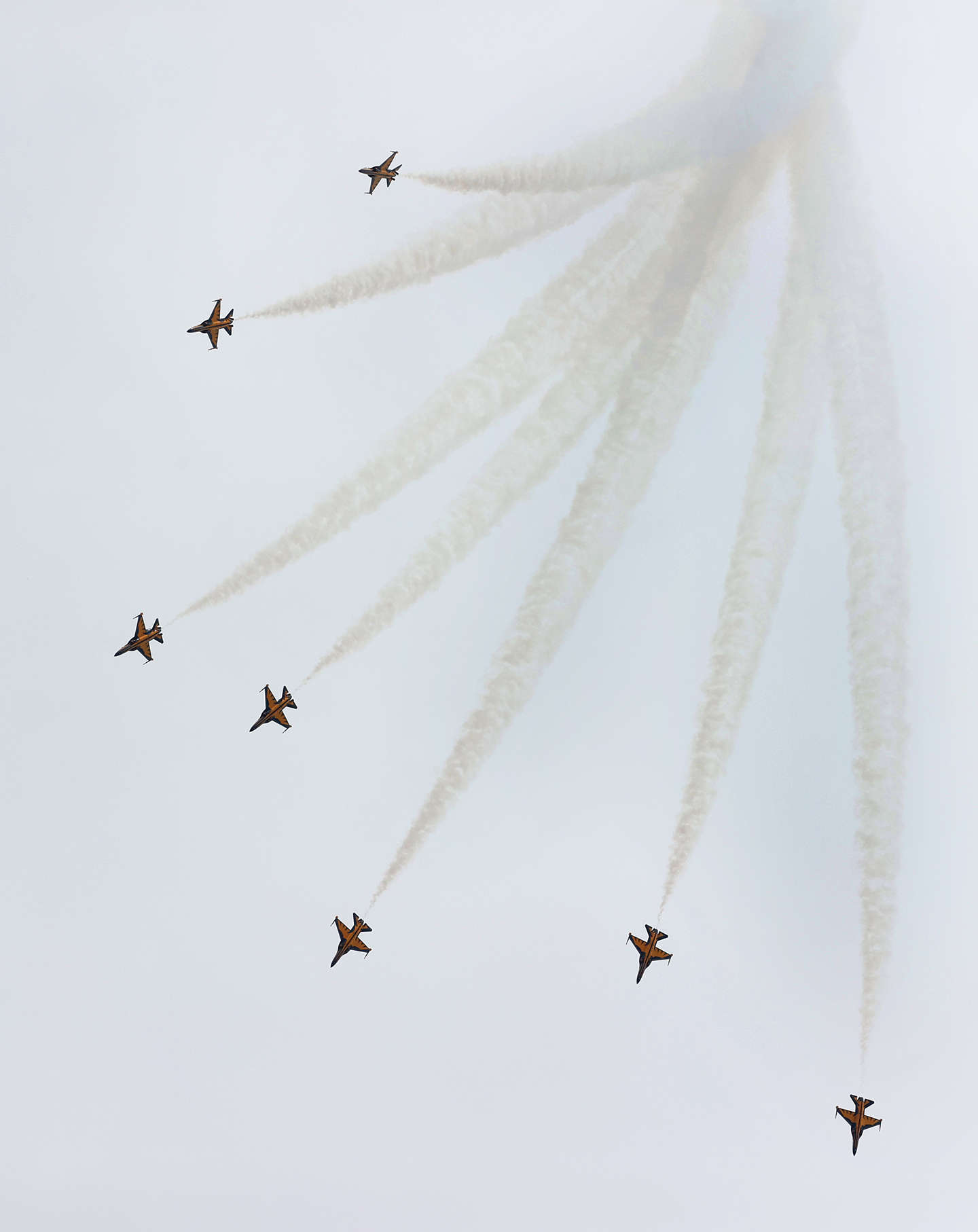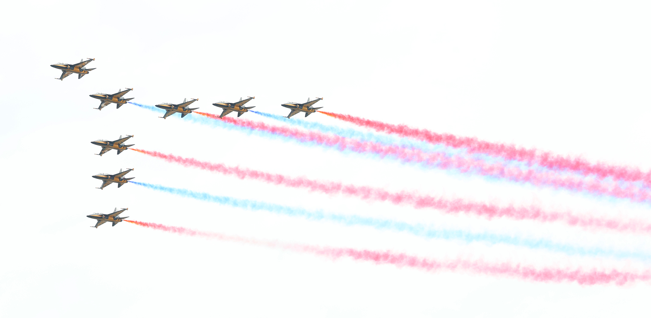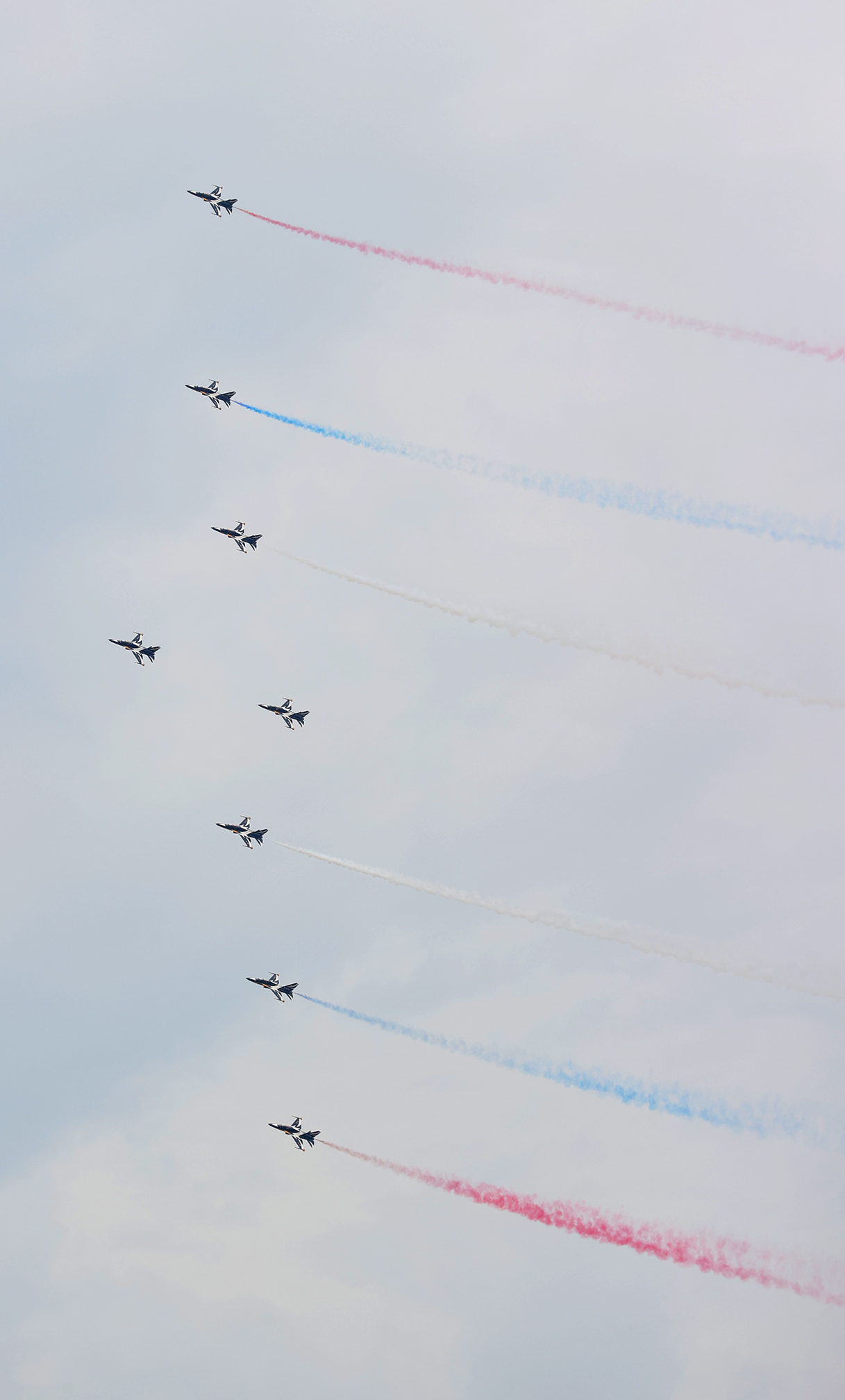 제24회 김제 지평선축제 부대행사로 열린 공군특수비행팀 블랙이글스 에어쇼가 2일 심포항에서 열렸다. 올해 7월 영국 리아트 에어쇼에서 최우수상과 인기상을 수상한 블랙이글스팀이 배면비행과 롤링어택을 한 번에 기동하며 가을 하늘에 연막으로 궤적을 남기고 있다.