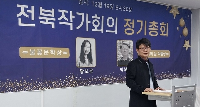 이날 정기총회에서는 12대 유강희 회장의 이임식과 함께 제18회 불꽃문학상, 제16회 작가의 눈작품상 시상식도 열렸다. 제18회 불꽃문학상은 <신유년에 핀 꽃>을 쓴 황보윤 소설가가, 제16회 작가의 눈작품상은 <비린내의 집>을 발표한 박복영 시인이 수상의 영광을 안았다. 불꽃문학상과 작가의 눈작품상 수상자에게는 각 300만원과 100만원의 상금과 상패가 주어졌다.